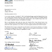 Letter from the Columbia River Gorge Commission to Representative Les AuCoin on November 30th, 2006, the twentieth anniversary of the National Scenic Area Act. The letter thanks Representative AuCoin for his contributions to the Columbia Gorge Scenic Area. This is one of a collection of digitized objects from the Les AuCoin Papers (MS.147) at the Pacific University Archives.