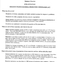 A summary of the Nuclear Weapon Material Production Termination Act, which was introduced by Representative Les AuCoin on November 18th, 1991. The act would have prohibited further production of tritium, plutonium, and highly enriched uranium for weapons and allocated the money saved to cleaning up environmental damaged caused by earlier production of nuclear weapons. This document discusses details of the bills, including descriptions of the nuclear materials, budget, and impact of the bill. This is one of a collection of digitized objects from the Les AuCoin Papers (MS.147) at the Pacific University Archives. See also PUA_MS147_105 for statement by Representative AuCoin on the Nuclear Weapon Material Production Termination Act. See also PUA_MS147_93 through PUA_MS147_110 for other materials related to nuclear arms control.