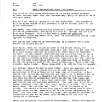 Memorandum on December 9th, 1987 to Representative Les AuCoin concerning an upcoming press conference on about Naum Chernobelsky. The Chernobelskys were a Ukrainian Jewish family of "refuseniks," an unofficial term for individuals, most commonly Soviet Jews, whose requests to emigrate from the Soviet Union were denied by officials. In the case of the Chernobelsky family, Naum's parents and sister were able to emigrate to Portland, Oregon in 1979, but he, his wife, and his children were not permitted to leave the Soviet Union. In February 1986, Naum's sister Raisa requested help from Representative AuCoin, who spent the next 2 years lobbying the Soviet Union for Naum Chernobelsky's release. Naum and his family were eventually allowed to emigrate from the Soviet Union to the United States in late 1988. This is one of a collection of digitized objects from the Les AuCoin Papers (MS.147) at the Pacific University Archives. See also PUA_MS147_111 through PUA_MS147_113 for other materials related to the Chernobelsky family.
