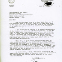 Letter from Oregon Governor Tom McCall to Representative Les AuCoin regarding McCall switching political parties. In 1973, AuCoin helped pass Governor McCall's measure to reform the funding of public schools. When the bill failed to become law in the face of considerable opposition by the Republican party, there were rumors that McCall might switch parties and run as a Democratic candidate for the Senate. AuCoin wrote to McCall offering his support. In this response, written on June 16th, 1973, McCall thanks AuCoin for his support, but ultimately decides to remain with the Republican party. This is one of a collection of digitized objects from the Les AuCoin Papers (MS.147) at the Pacific University Archives.