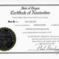 Certificate of Nomination declaring "Les AuCoin has been nominated as Democratic candidate for United States Senator at the Primary Election held May 19, 1992". Signed by Secretary of State Phil Keisling on June 18th, 1992. In the Democratic primary, AuCoin’s biggest opponent was Harry Lonsdale, a multi millionaire businessman who ran as an outsider to Washington politics. The primary results were close enough to trigger an automatic recount, and AuCoin was eventually certified as the winner by 330 votes. AuCoin went on to face Senator Bob Packwood in the general election, and Packwood was ultimately elected to the Senate. This is one of a collection of digitized objects from the Les AuCoin Papers (MS.147) at the Pacific University Archives.