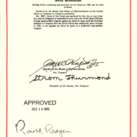 Copy of the Joint Resolution preventing funding for tests of the anti-satellite weapons in space until the Soviet Union performs a similar test in space. The resolution is signed by President Ronald Reagan and approved on December 19th, 1985. This is one of a collection of digitized objects from the Les AuCoin Papers (MS.147) at the Pacific University Archives.