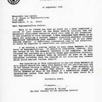 Letter from Malcolm Wilkey, Special Counsel to the Attorney General, clearing Representative Les AuCoin of any criminal violations regarding the House Bank. In 1991 a government audit of the bank, where House members could deposit paychecks, showed hundreds of members with overdrafts on their accounts. Further investigation eventually revealed that, while a few members intentionally abused the bank, many of these overdrafts were caused by the bank’s delay in processing deposits. In this letter from September 18th, 1992, the US Department of Justice cleared AuCoin of any wrongdoing with the bank. The House Bank was a major issue in the 1992 election, and AuCoin's involvement was frequently attacked by political opponents.This is one of a collection of digitized objects from the Les AuCoin Papers (MS.147) at the Pacific University Archives. See also PUA_MS147_137 for a statement by AuCoin addressing the House Bank audit.