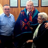 Representative Les AuCoin poses with Reyn Leo and Kathryn Harrison, both former chairs of the Confederated Tribes of Grand Ronde Tribal Council. The Confederated Tribes of Grand Ronde includes over 30 tribes and bands from Oregon, California, and Washington. In the early 1850s, the United States forced these tribes off their lands, eventually establishing the Grand Ronde Reservation in Oregon in 1857. In 1954, Congress passed the Western Oregon Indian Termination Act, which ended federal recognition of the Confederated Tribes of Grand Ronde. Beginning in the 1970s, tribal leaders began working to restore the tribe's federal status, lobbying Congress to first pass the Grand Ronde Restoration Act in 1983, which restored federal recognition, then the Grand Ronde Reservation Act in 1988, which reestablished a small reservation. Representative AuCoin worked with the tribe on both bills. This photo was taken in 2018, at a celebration of the 35th anniversary of the tribe's restoration. This is one of a collection of digitized objects from the Les AuCoin Papers (MS.147) at the Pacific University Archives. The original photo remains with the AuCoin family.