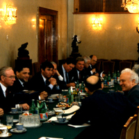 A photograph of the United States congressional delegation meeting with the Soviet Union.