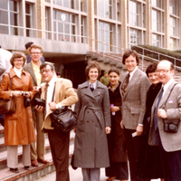 Les AuCoin, Susan AuCoin, and other members of the U.S. Delegation to China pose in front of a building.