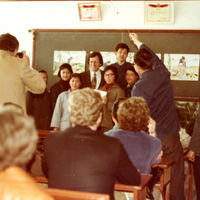 A photograph of Les AuCoin posing with a group of people in a Chinese classroom.