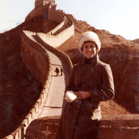 A photograph of Susan AuCoin posing on the Great Wall of China.