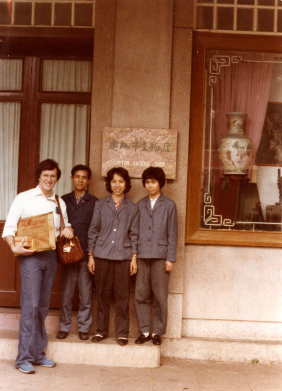 A photograph of Les AuCoin with three other people in front of a Chinese antique shop.