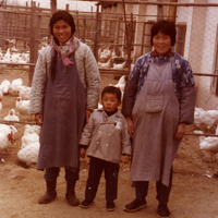 A photograph of two women and a child at a chicken farm.