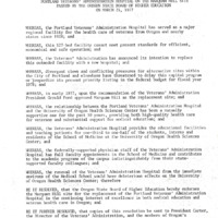 The official Oregon State Board of Higher Education's resolution "in support of the Portland Veterans' Administration Hospital on the Marquam Hill Site." Passed on March 25, 1977, the board advocates for replacement facilities for the Portland V.A. hospital. This is one of a collection of digitized objects from the Les AuCoin Papers (MS.147) at the Pacific University Archives. AuCoin served in the Oregon House of Representatives (1971-1975) and in the United States House of Representatives from Oregon's 1st District (1975-1993).