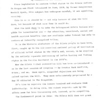 In a text written for publication in the Portland newspaper The Oregonian, Congressman Les AuCoin advocates for House Resolution 7259 of the 95th Congress (1977-1978), the Siletz Indian Tribe Restoration Act, which re-established federal tribal status for the Siletz Indians. AuCoin explained how the bill would not affect fishing and hunting rights, but would grant humanitarian aid eligibility. This is apparently the original typescript of an editorial that AuCoin submitted to The Oregonian, which may have been published in June 1977. This is one of a collection of digitized objects from the Les AuCoin Papers (MS.147) at the Pacific University Archives. AuCoin served in the Oregon House of Representatives (1971-1975) and in the United States House of Representatives from Oregon's 1st District (1975-1993).