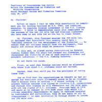 Before the Subcommittee on Fisheries and Wildlife Conservation, and the House Merchant Marine and Fisheries Committee, Congressman Les AuCoin brought attention to a loophole in passed legislation that he otherwise favored, the 200-mile fishing zone law. The 200-mile fishing zone aimed to protect the U.S. fishing industry by prioritizing American fishermen within 200 miles of the U.S. coastline. Congressman AuCoin expressed how foreign investors got around the law by investing in the American fishing industry. Les AuCoin proposed amendments to the original law in order to ensure the prioritization of American fisherman. This is one of a collection of digitized objects from the Les AuCoin Papers (MS.147) at the Pacific University Archives. AuCoin served in the Oregon House of Representatives (1971-1975) and in the United States House of Representatives from Oregon's 1st District (1975-1993).