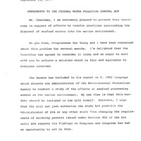 In a speech before the House Committee on Public Works and Transportation, Congressman Les AuCoin advocated for amending the Federal Water Pollution Control Act to address concerns regarding the "disposal of seafood wastes into the marine environment." AuCoin described how Environmental Protection Agency regulations can be too strict in preventing the dumping of biodegradable waste, causing fish life to face a decrease in seafood particles to feed on. This is one of a collection of digitized objects from the Les AuCoin Papers (MS.147) at the Pacific University Archives. AuCoin served in the Oregon House of Representatives (1971-1975) and in the United States House of Representatives from Oregon's 1st District (1975-1993).