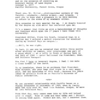 In a speech, U.S. Congressman and Pacific University alumnus Les AuCoin attends the rededication of Marsh Hall and accepts an honorary doctor of laws degree from the university in Forest Grove, Oregon. Les AuCoin first attended Pacific University from 1960-1961 before leaving to enlist in the U.S. Army. He returned to Pacific in 1964, employed as the Director of the university's Public Information department, while working towards his Bachelor of Arts degree in journalism. AuCoin graduated from Pacific University in 1969. This is one of a collection of digitized objects from the Les AuCoin Papers (MS.147) at the Pacific University Archives. AuCoin served in the Oregon House of Representatives (1971-1975) and in the United States House of Representatives from Oregon's 1st District (1975-1993).