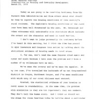 In an opening statement to the Subcomittee on Housing and Community Development of the Committee on Banking, Finance, and Urban Affairs, Congressman Les AuCoin advocated for addressing the housing needs of rural Americans. He shared an example of an Oregon migrant labor camp with inadequate facilities. AuCoin's statement came before expected congressional testimony from the Farmers Home Administration regarding national rural housing needs. This is one of a collection of digitized objects from the Les AuCoin Papers (MS.147) at the Pacific University Archives. AuCoin served in the Oregon House of Representatives (1971-1975) and in the United States House of Representatives from Oregon's 1st District (1975-1993).