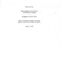 In a statement before the Subcommittee on Trade of the House Committee on Ways and Means, U.S. Congressman Les AuCoin advocated for H.R. 8814, "a bill to reduce until June 30, 1980, the column 2 rates of duty on woven fabrics of silk." The bill aimed to make it temporarily easier to import silk to the United States, especially from the People's Republic of China. H.R. 8814 was introduced to Congress by Congressman AuCoin, but never came to a vote.This is one of a collection of digitized objects from the Les AuCoin Papers (MS.147) at the Pacific University Archives. AuCoin served in the Oregon House of Representatives (1971-1975) and in the United States House of Representatives from Oregon's 1st District (1975-1993).