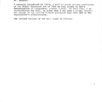 In communications with the Speaker of the House, Congressman Les AuCoin provided technical changes to H.R. 11214, a bill that he sponsored which aimed to amend the Higher Education Act of 1965. The amendment would have changed how independent student status was determined by the United States Department of Health, Education, and Welfare. The bill was introduced to the House of Representatives, but never came to a vote. This is one of a collection of digitized objects from the Les AuCoin Papers (MS.147) at the Pacific University Archives. AuCoin served in the Oregon House of Representatives (1971-1975) and in the United States House of Representatives from Oregon's 1st District (1975-1993).