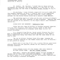As part of the Congressional Record, U.S. Congressman Les AuCoin briefly expressed his support for improved trading relations between the U.S. and the People's Republic of China. As part of the congressional Extension of Remarks, Congressman AuCoin shared two articles by the Wall Street Journal and the Washington Post regarding the benefits of trading with China. This is one of a collection of digitized objects from the Les AuCoin Papers (MS.147) at the Pacific University Archives. AuCoin served in the Oregon House of Representatives (1971-1975) and in the United States House of Representatives from Oregon's 1st District (1975-1993).