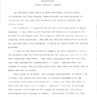 In a speech, U.S. Congressman Les AuCoin discussed the American housing industry and the increasing price of housing, as well as the Housing and Community Development Act of 1978. The U.S. housing market saw the price of housing increase drastically in the 1970s due to inflation. This is one of a collection of digitized objects from the Les AuCoin Papers (MS.147) at the Pacific University Archives. AuCoin served in the Oregon House of Representatives (1971-1975) and in the United States House of Representatives from Oregon's 1st District (1975-1993).