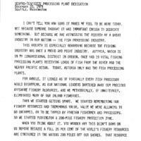 A draft of a speech by U.S. Congressman Les AuCoin at the Seapro-Seafreeze Processing Plant Dedication on December 20, 1978, in Seattle, Washington. In his speech, Congressman AuCoin declared the new processing plant a win for the U.S. fish processing industry. He explained how the fishing industry had previously been on the decline in the U.S., giving the example of Astoria going from 19 fishing processing plants to only two. This is one of a collection of digitized objects from the Les AuCoin Papers (MS.147) at the Pacific University Archives. AuCoin served in the Oregon House of Representatives (1971-1975) and in the United States House of Representatives from Oregon's 1st District (1975-1993).
