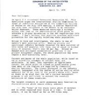 In a letter to a congressional colleague, U.S. Congressman Les AuCoin advocated for Concurrent Resolution 92, which would urge "the International Whaling Commission to adopt an indefinite moratorium on the commercial killing of whales at its July 1979 meeting." This is one of a collection of digitized objects from the Les AuCoin Papers (MS.147) at the Pacific University Archives. AuCoin served in the Oregon House of Representatives (1971-1975) and in the United States House of Representatives from Oregon's 1st District (1975-1993).