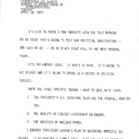 A speech by U.S. Congressman Les AuCoin titled "Energy" given at the Oregon House of Representatives on April 18, 1979. In his speech, Congressman AuCoin discusssed "1. The president's oil decontrol plan and the windfall profits tax. 2. The quality of cabinet leadership on energy. 3. The question of nuclear power." This is one of a collection of digitized objects from the Les AuCoin Papers (MS.147) at the Pacific University Archives. AuCoin served in the Oregon House of Representatives (1971-1975) and in the United States House of Representatives from Oregon's 1st District (1975-1993).