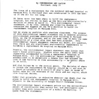A speech by U.S. Congressman Les AuCoin regarding the discussion of a replacement Veterans Administration hopsital on Marquam Hill in Portland, Oregon, and the potential addition of an environmental impact statement for it. In his speech, Congressman AuCoin explained how an environmental impact statement would remove "any lingering doubts or obstacles for support of the VA's decision to build the replacement hospital at Marquam Hill." This is one of a collection of digitized objects from the Les AuCoin Papers (MS.147) at the Pacific University Archives. AuCoin served in the Oregon House of Representatives (1971-1975) and in the United States House of Representatives from Oregon's 1st District (1975-1993).