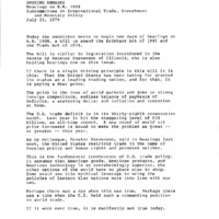 A speech by U.S. Congressman Les AuCoin at the hearings of H.R. 1908, given to the Subcommittee on International Trade, Investment, and Monetary Policy on July 23, 1979. H.R. 1908 was sponsored by Congressman AuCoin, and was officially titled "A bill to amend the Export-Import Bank Act of 1945 with respect to credit to Communist countries, and for other purposes." The bill would have additionally amended the Trade Act of 1974. This is one of a collection of digitized objects from the Les AuCoin Papers (MS.147) at the Pacific University Archives. AuCoin served in the Oregon House of Representatives (1971-1975) and in the United States House of Representatives from Oregon's 1st District (1975-1993).
