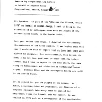 A speech by U.S. Congressman Les AuCoin titled "Shatter the Silence, Vigil 1979" given on behalf of Solomon Alber and added to the Congressional Record. Solomon Alber and his family were among thousands of "refuseniks," or Soviet Jews of the era who were denied visas to emigrate by the Soviet government. Congressman AuCoin advocated for the Alber family, describing their plight of being outcasted in their career and social communities in the Soviet Union after they were denied emigration visas. This is one of a collection of digitized objects from the Les AuCoin Papers (MS.147) at the Pacific University Archives. AuCoin served in the Oregon House of Representatives (1971-1975) and in the United States House of Representatives from Oregon's 1st District (1975-1993).
