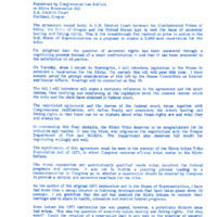 A statement by U.S. Congressman Les AuCoin on the Siletz Reservation Bill, delivered at the Portland, Oregon U.S. District Court on May 2, 1980. In his statement, U.S. Congressman Les AuCoin advocated for the Siletz Indians, who became the first Oregon tribe and the second nationally to have their their federal tribal status re-established in 1977. Congressman AuCoin also described his plans to introduce a bill in Congress to create a reservation for the Siletz Indians, which eventually became House Resolution 7267 of the 96th Congress (1979-1980). This is one of a collection of digitized objects from the Les AuCoin Papers (MS.147) at the Pacific University Archives. AuCoin served in the Oregon House of Representatives (1971-1975) and in the United States House of Representatives from Oregon's 1st District (1975-1993).