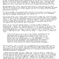 A statement by U.S. Congressman Les AuCoin given at the field hearings for the Magnuson Act on March 18, 1985, in Newport, Oregon. The Magnuson Act was officially H.R.5658 of the 99th Congress and titled "A bill to amend the definition of 'vessel of the United States' in the Magnuson Fishery Conservation and Management Act." In his statement, Congressman AuCoin advocated for changes to the original Magnuson Fishery Conservation and Management Act of 1976. This is one of a collection of digitized objects from the Les AuCoin Papers (MS.147) at the Pacific University Archives. AuCoin served in the Oregon House of Representatives (1971-1975) and in the United States House of Representatives from Oregon's 1st District (1975-1993).