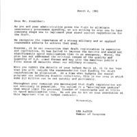 A letter to President Ronald Reagan from U.S. Congressman Les AuCoin regarding the Reagan administration's upcoming decision regarding action on draft registration policy, dated March 4, 1981. In his letter, Congressman AuCoin urged President Reagan to stand against draft registration and for him to recommend that draft registration funding should be eliminated in the upcoming budget. This is one of a collection of digitized objects from the Les AuCoin Papers (MS.147) at the Pacific University Archives. AuCoin served in the Oregon House of Representatives (1971-1975) and in the United States House of Representatives from Oregon's 1st District (1975-1993).