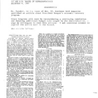 A Business Week magazine article titled "Reaganomics," as placed in the Extension of Remarks section of the Congressional record by US Congressman Les AuCoin on December 4, 1981. The article discussed President Ronald Reagan's supply-side economic plan to cut taxes and increase military spending, an economic school of thought that was then famously coined "Reaganomics."