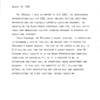 The House floor remarks of US Congressman Les AuCoin advocating for H.R. 6863, the Supplemental Appropriations Act of 1982, on August 18, 1982. In his speech, Congressman AuCoin expresses his support of the bill's inclusion of additional appropriations for federally supported education programs, and describes how the bill was criticized by the Reagan Administration for decreasing defense, military, and foreign aid spending.