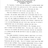 Testimony of US Congressman Les AuCoin before the House Ways and Means Subcommittee on Public Assistance and Unemployment Compensation advocating for HR7327 - A bill to increase the number of weeks for which Federal supplemental unemployment compensation is payable. In his testimony delivered on December 8, 1982, Congressman AuCoin described how 11 million Americans were out of work, with the unemployment being higher in Oregon than the national average (11.5% versus 10.8%, respectively). He described how 12,500 Oregonians were expected to lose their unemployment benefits unless further legislation, specifically HR7327, was passed.