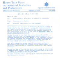 A letter from US Congressman Les AuCoin to staff contacts on the House Task Force on Industrial Innovation and Productivity regarding a briefing on a Continental Airlines purchase by employees of the company, dated April 16, 1981. In what he describes as "the fight for airline deregulation," AuCoin points out "the unique plan of Continental Airline's employees to buy controlling interest in their company and the plan's implications for industrial productivity and capital formation."