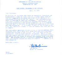 A letter from US Congressman Les AuCoin to a congressional colleague advocating for the proposed Continental Airlines purchase by employees in April 1981, describing it as solving "two of the most acute problems facing American business and industry today: declining productivity and capital formation." He wrote this letter as the Chairman of the House Task Force on Industrial Innovation.