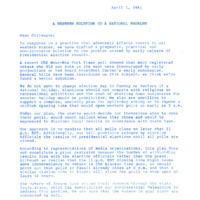 A letter from US Congressman Les AuCoin to a congressional colleague titled "A Western Solution to a National Problem," dated April 1, 1981. In his letter, AuCoin advocated for legislation that would allow states to choose for themselves when to open polls, count ballots, and disclose local results, with all polls closing no later than 11 p.m. EST and prohibiting the release of election results of presidential elections until all polls were closed. As he noted, this legislation was notably written following the 1980 presidential election, when Jimmy Carter conceded the election before polls closed on the West Coast.