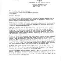 The rough draft of a letter to Chairman Neal Smith of the Subcommittee on State, Justice, Commerce, and Judiciary, from several US representatives advocating for the Western States Information Network (WSIN) to be included in the fiscal year 1982 federal budget following the news that the Reagan Administration planned to eliminate monetary support for the organization. The letter was dated June 4, 1981, and states that WSIN was crucial in supporting "local law enforcement narcotic investigations in the states of Alaska, California, Hawaii, Oregon, and Washington by providing analytical, financial, and equipment services."