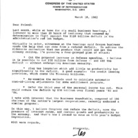 A letter by US Congressman Les AuCoin addressed to a "friend" -- perhaps a congressional colleague -- describing his intent to fight against a $120 billion federal budget deficit proposed by the Reagan Administration. Ccongressman AuCoin shared his proposals to reduce the deficit, which included cutting the proposed increase in defense spending, getting rid of tax loopholes, and deferring the third year of the personal income tax cut.