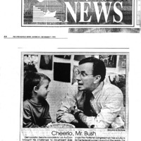 A clipping of a Springfield News article titled "Cheerio, Mr. Bush," published on December 7, 1941. Written during US Congressman Les AuCoin's time on the campaign trail for the 1992 US Senate race, the article features a photograph of Congressman AuCoin with four-year-old Justin Bush at a breakfast for Head Start students.