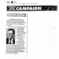 A collection of newspaper articles from the 1992 US Senate race in Oregon. The collection includes an Oregonian article on Congressman AuCoin's endorsement by the National Organization for Women, an Oregonian article titled "Packwood in Peril" by Jeff Mapes, a Register-Guard article titled "AuCoin: Play fair or we'll raise our trade barriers" by Brent Walth, a Roll Call article titled "Political Briefing" by Tim Curran, an Oregonian article titled "AuCoin advocates health-care system similar to Canada's" by Jeff Mapes, and a Corvallis Gazette-Times article titled "AuCoin calls for huge defense cut."