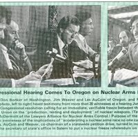 "Congressional Hearing Comes to Oregon on Nuclear Arms Freeze" newsletter article