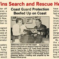 An article from an 1986 edition of The AuCoin Report newsletter titled "Newport Wins Search and Rescue Helicopters." The article describes how US Congressman Les AuCoin had advocated for and succeeded in having Congress approve plans for a search and rescue helicopter base for the Coast Guard in the Newport Area.