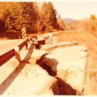 A photograph featuring the Henry Hagg Lake road landslides, taken by a staff member of US Congressman Les AuCoin in early 1982. Multiple slides were discovered on the roads bordering Henry Hagg Lake, including SW Scoggins Valley Road and SW West Shore Drive.