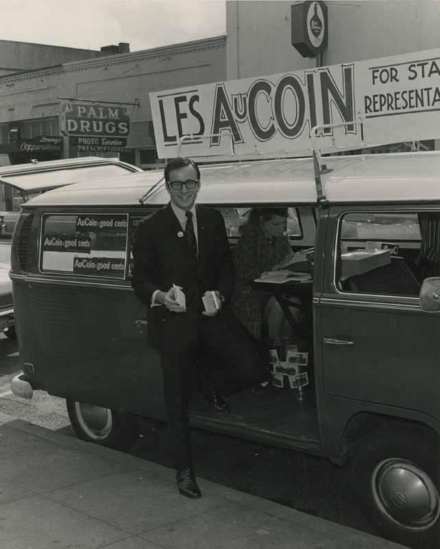 AuCoin used his experience door-to-door campaigning for McCarthy in his race against Republican E.G. Kyle. While Kyle’s campaign was the favorite to win, AuCoin visited 10,000 homes before the general election, with volunteers and canvassers visiting even more. In the last two weeks of the campaign, AuCoin built momentum with lawn signs and full-page newspaper advertisements. In the end, he won the election by twelve percentage points. The campaign established practices that appeared in AuCoin’s later campaigns, like the spaghetti dinner fundraiser, door-to-door campaigning, and the key roles of Bob Crane and Sue AuCoin.