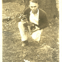A photograph of a male Pacific University student holding the Boxer mascot. The original Boxer mascot was a gift to the school from a missionary named Reverend J. E. Walker. He acquired the Boxer while on a mission trip to China. The Boxer went missing after a Boxer Toss in 1969. This photograph appears in an album that was compiled by Edith Hansen McGill, a 1930 Pacific University graduate.