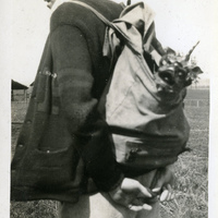 A photograph of Pacific University student, Douglas Dreeszen, with the Boxer mascot in a backpack. The original Boxer mascot was a gift to the school from a missionary named Reverend J. E. Walker. He acquired the Boxer while on a mission trip to China. The Boxer went missing after a Boxer Toss in 1969. This photograph appears in an album that was compiled by Edith Hansen McGill, a 1930 Pacific University graduate.