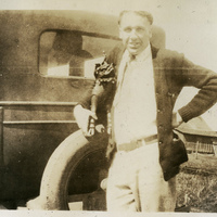 A photograph of Pacific University student, Douglas Dreeszen, holding the Boxer mascot while leaning on a car. The original Boxer mascot was a gift to the school from a missionary named Reverend J. E. Walker. He acquired the Boxer while on a mission trip to China. The Boxer went missing after a Boxer Toss in 1969. This photograph appears in an album that was compiled by Edith Hansen McGill, a 1930 Pacific University graduate.